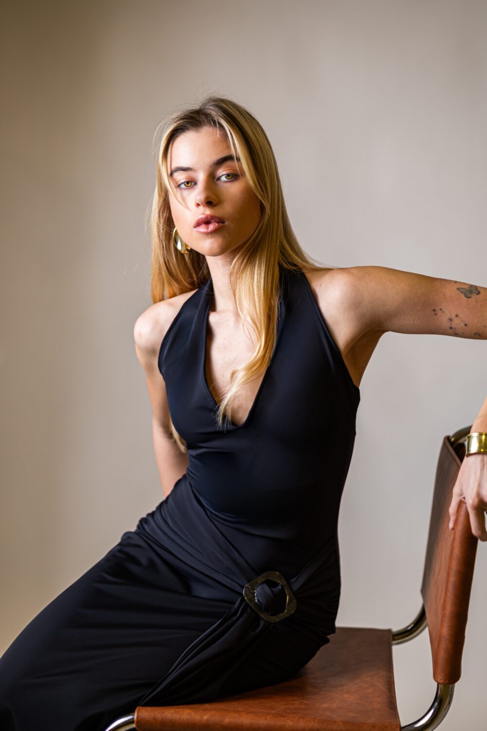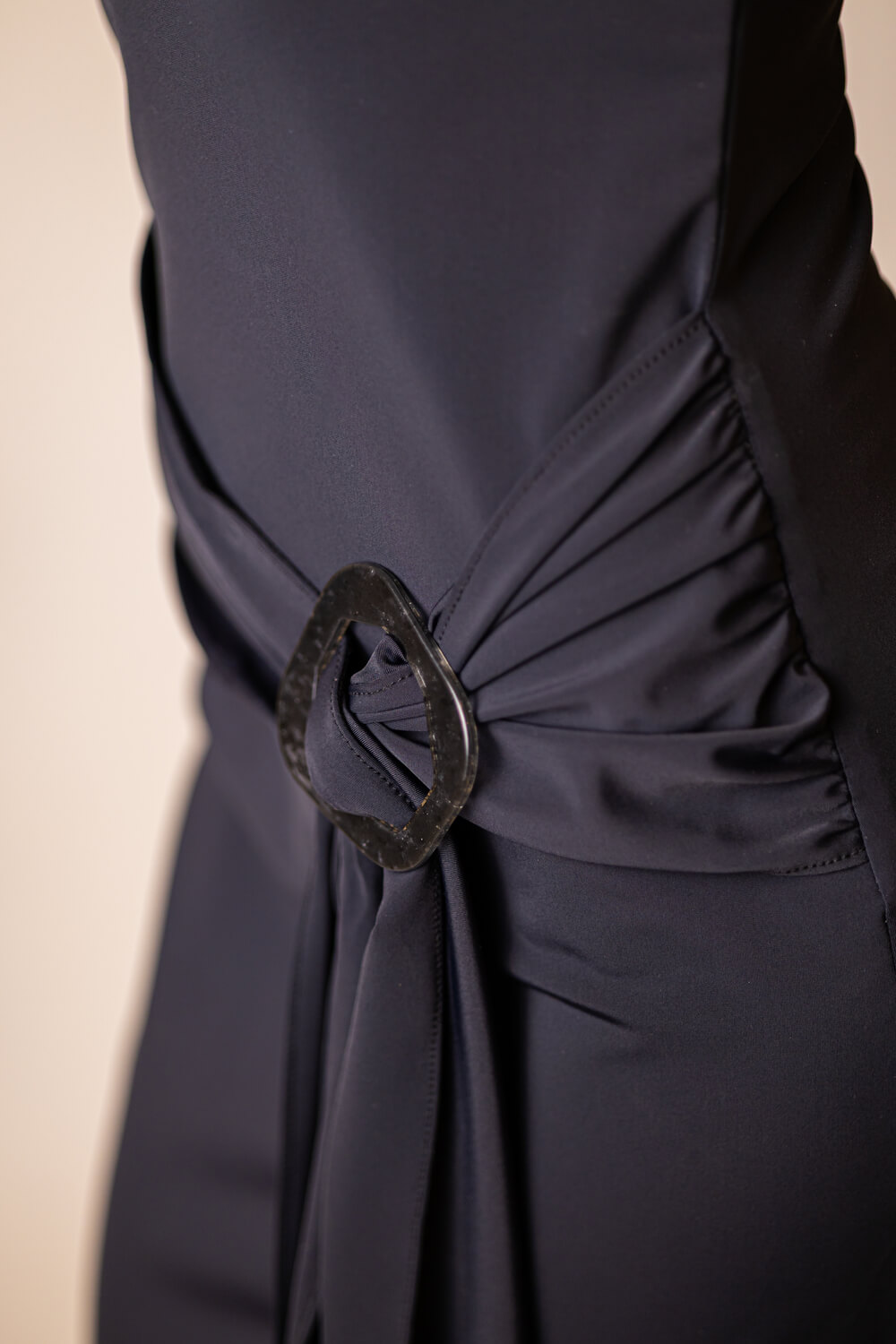 A modern interpretation of timeless elegance. Faena creates a powerful silhouette with its sculpting, body-hugging fabric and sophisticated bone buckle detail. Its minimal design, elevated by the nobility of black, reflects the purest expression of understated luxury.