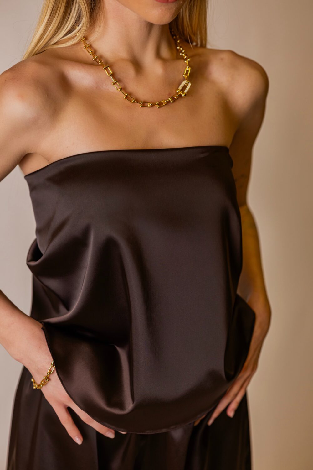 A modern interpretation of elegance, the Satin L’one Set adds a sophisticated touch to your style with the perfect harmony of satin trousers and a strapless crop design. Thanks to its special viscose and silk blend fabric, it feels soft and fluid against the skin, while the natural sheen of the satin texture creates an eye-catching silhouette in any setting. With its minimal and feminine lines, it offers effortless chic for both daytime elegance and evening occasions.