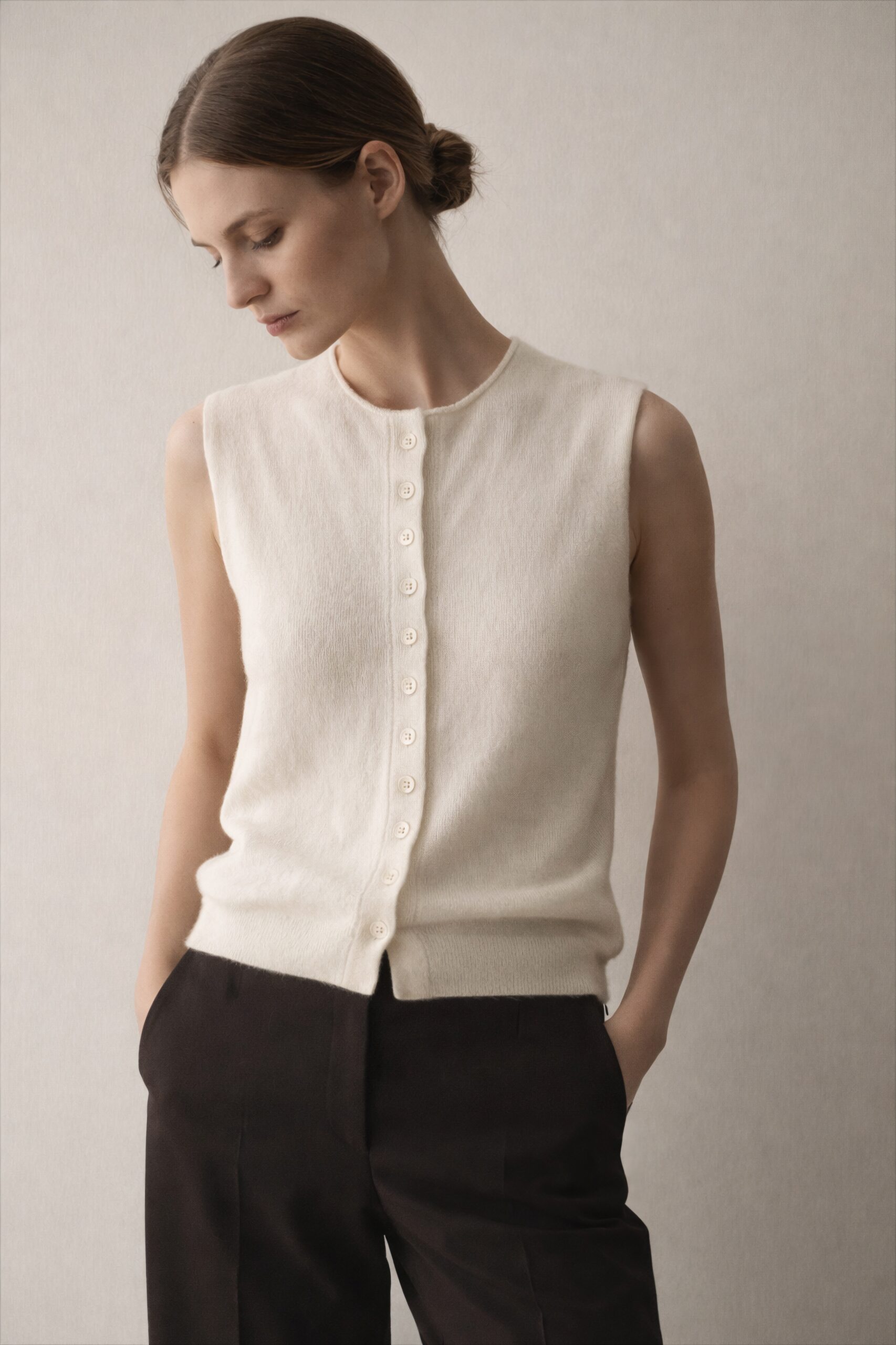 Crafted from a luxurious cashmere-blend yarn, this piece offers an exceptionally soft feel and effortless sophistication. Its lightweight structure ensures all-day comfort, while the clean, minimal design creates a modern yet enduring silhouette. A wardrobe essential designed to transcend seasons.